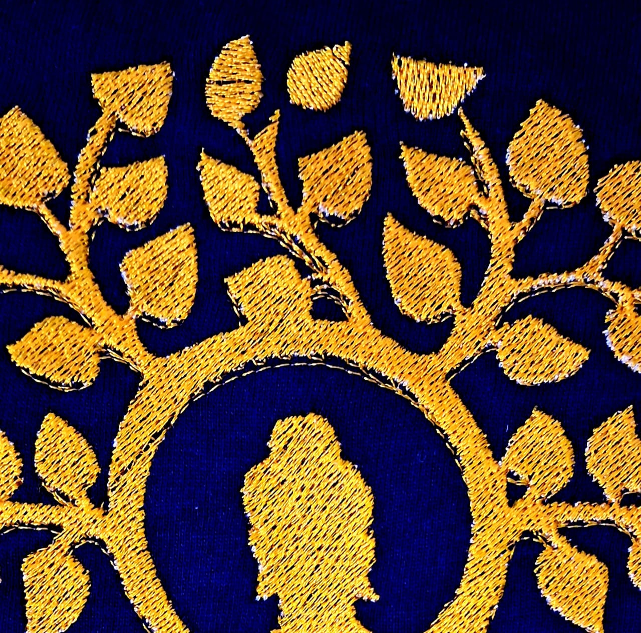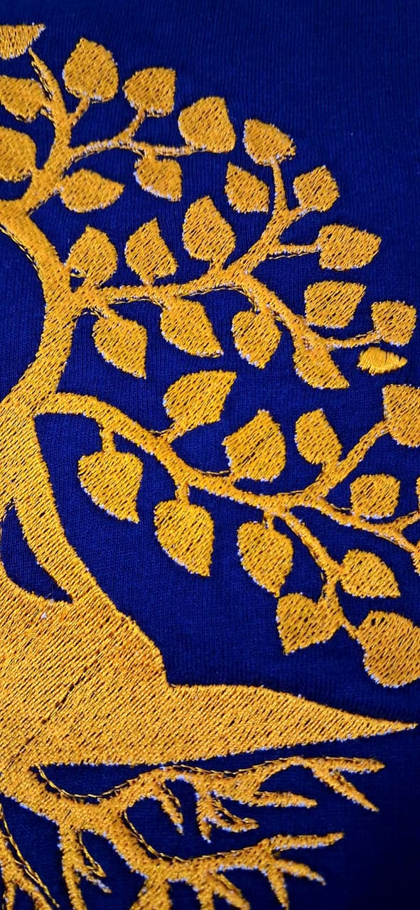 Golden Buddha with a Bodhi tree backdrop, embroidered on navy blue.
