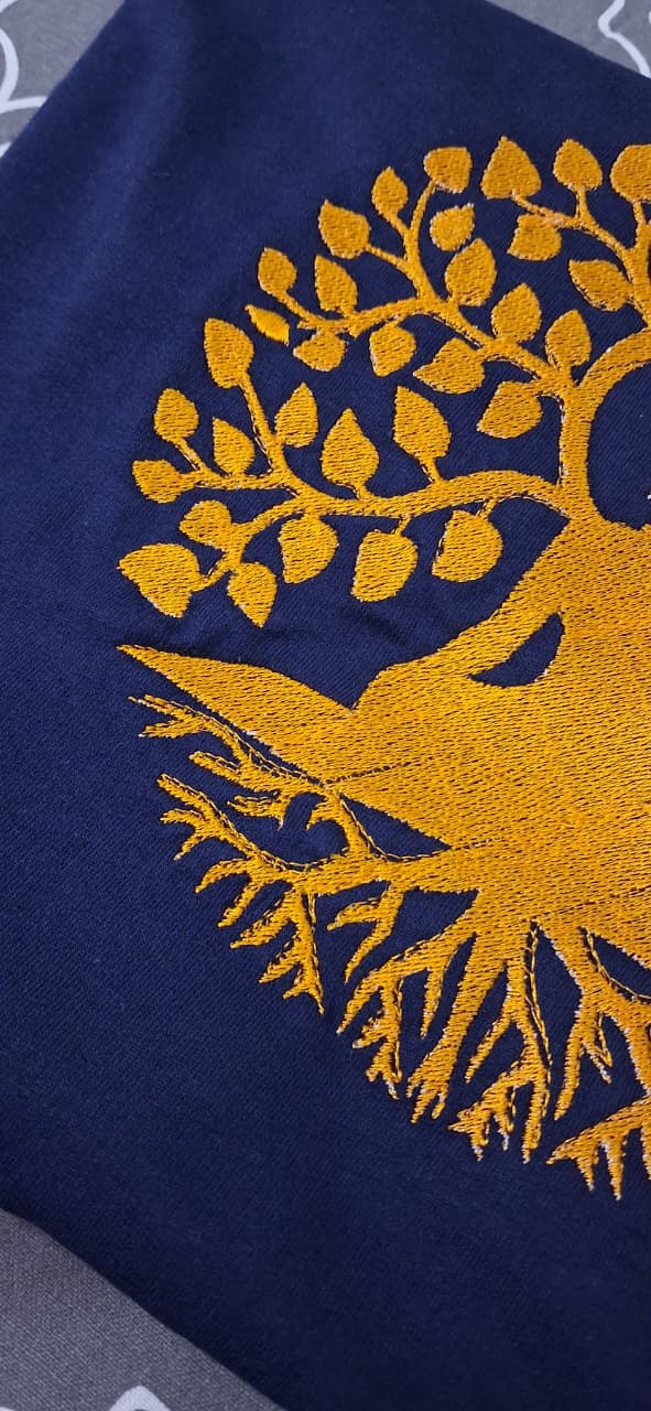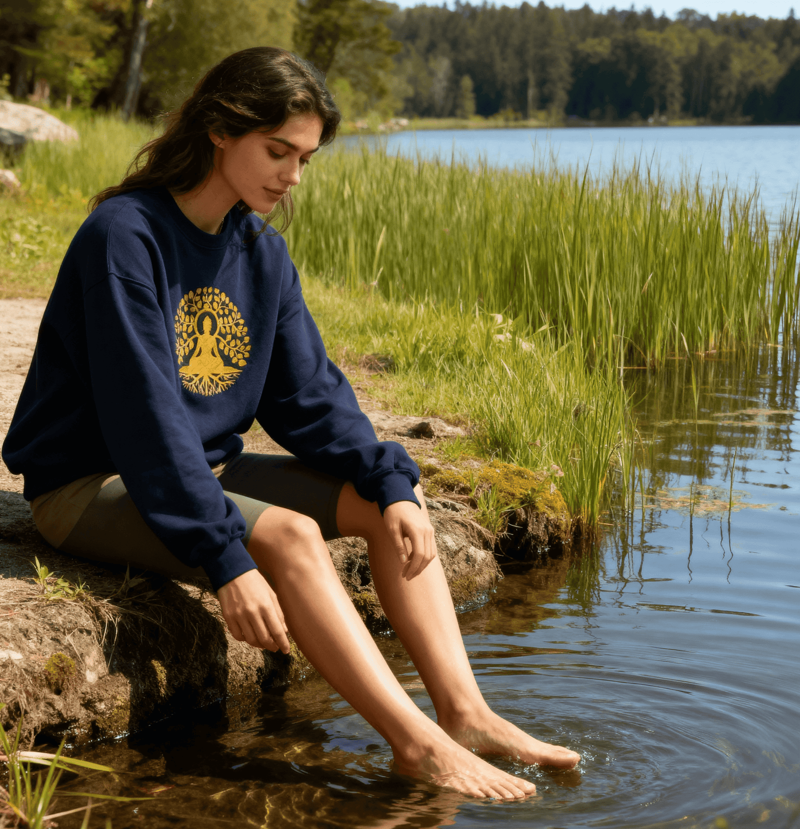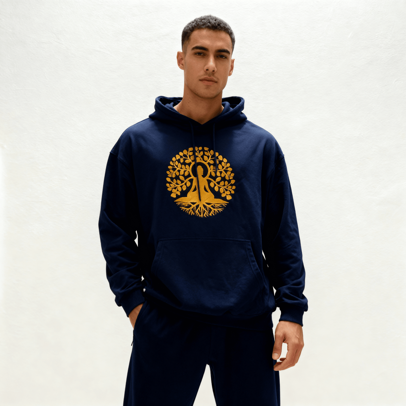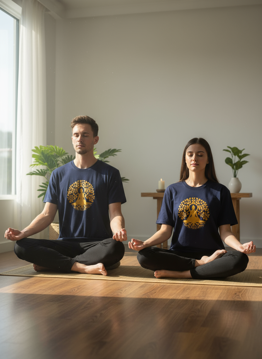 Navy blue T-shirt featuring a refined golden artwork of Buddha and the Bodhi tree, capturing a quiet narrative of peace and the comfort found beneath its sacred shade. Made from soft fabric, it features a relaxed fit that keeps you comfortable from the studio to everyday errands. Available in sizes XS to XL, this versatile t-shirt pairs well with activewear, jeans, or lounging at home. Experience tranquility and comfort in every moment with this must-have piece.