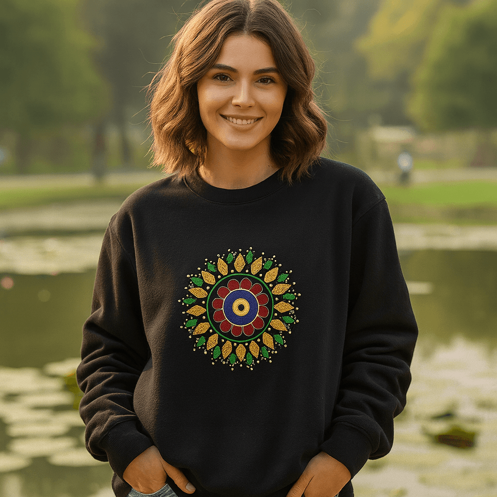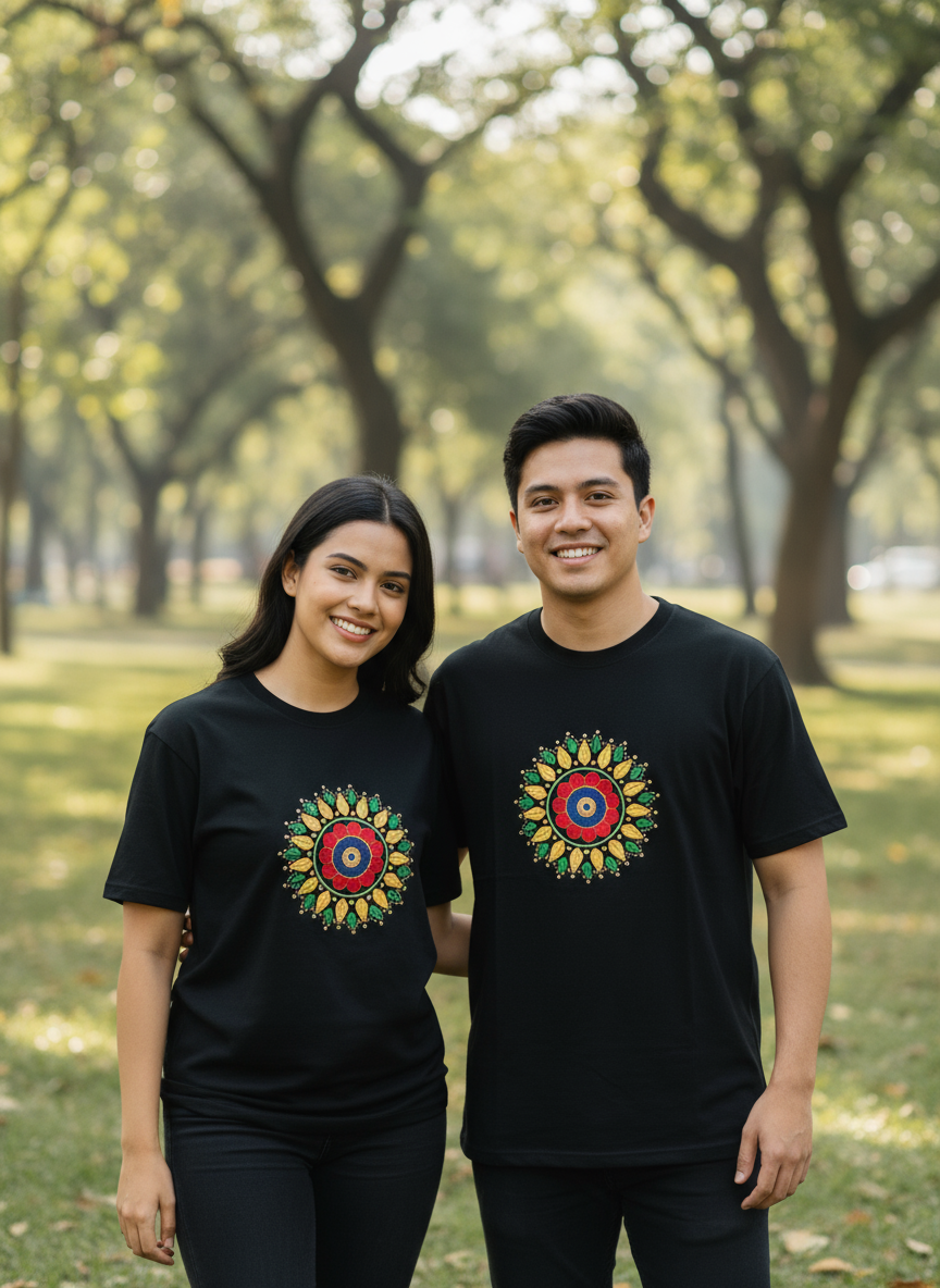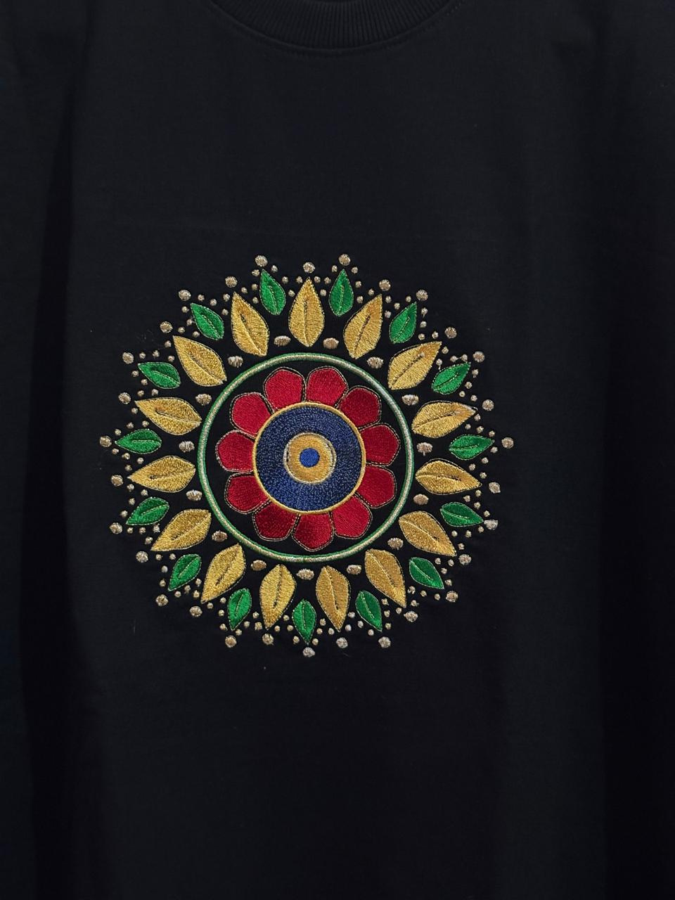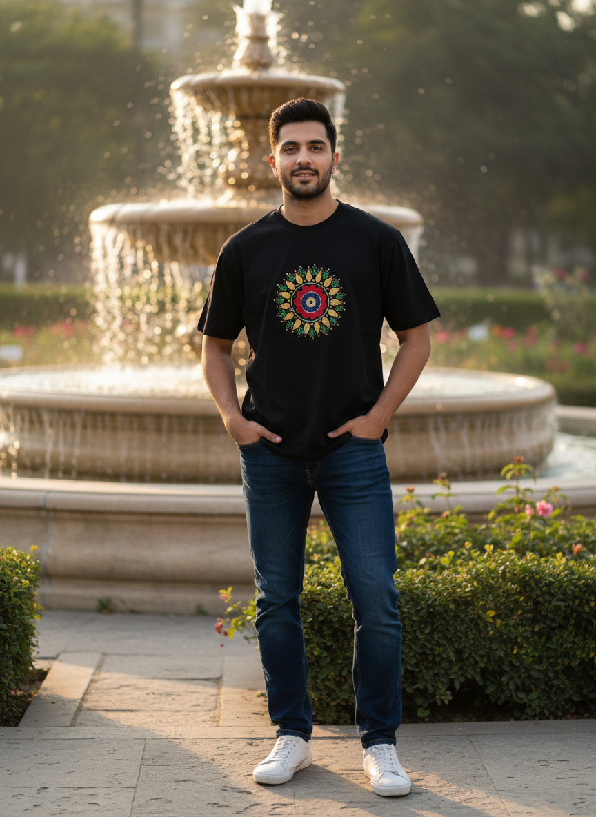 Elevate your everyday look with this striking black t-shirt, featuring a vibrant, intricately detailed mandala design at the center. Crafted from soft, breathable cotton, this tee combines comfort with artistic flair, making it the perfect choice for anyone who values creative expression in their casual wardrobe. Available in a range of sizes to ensure the ideal fit, this unique statement piece is a must-have for those who love to stand out.
