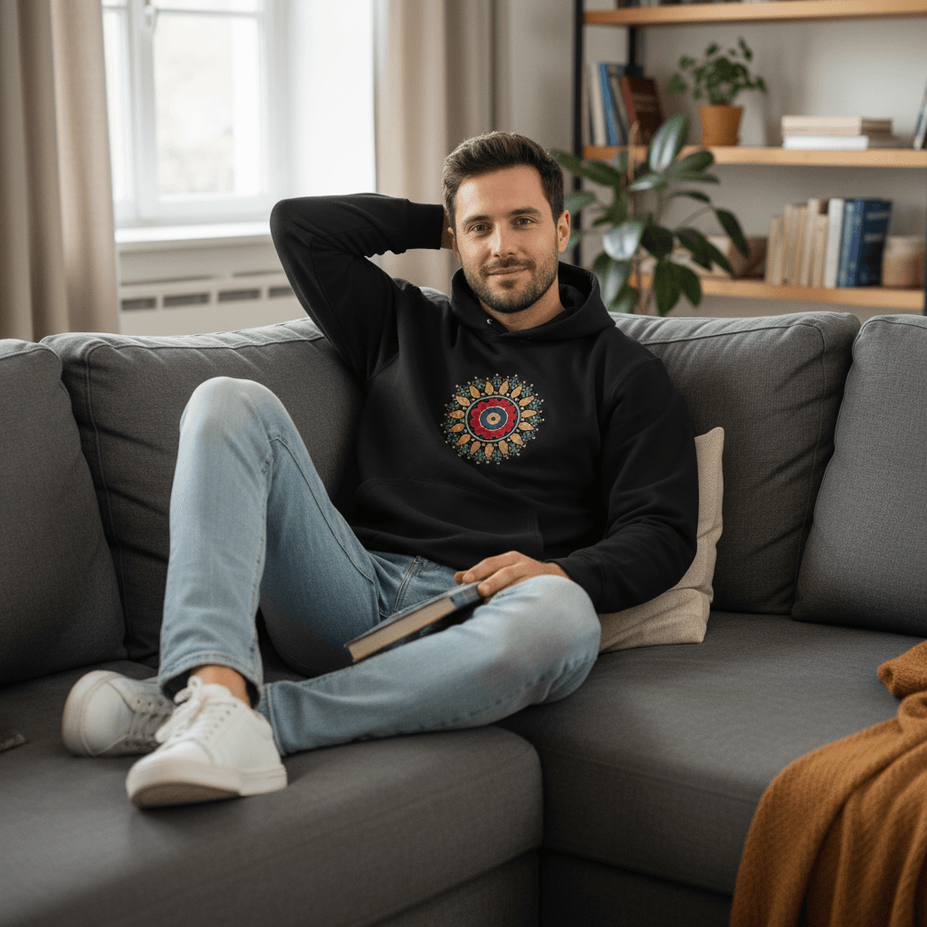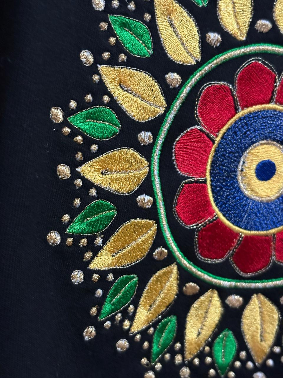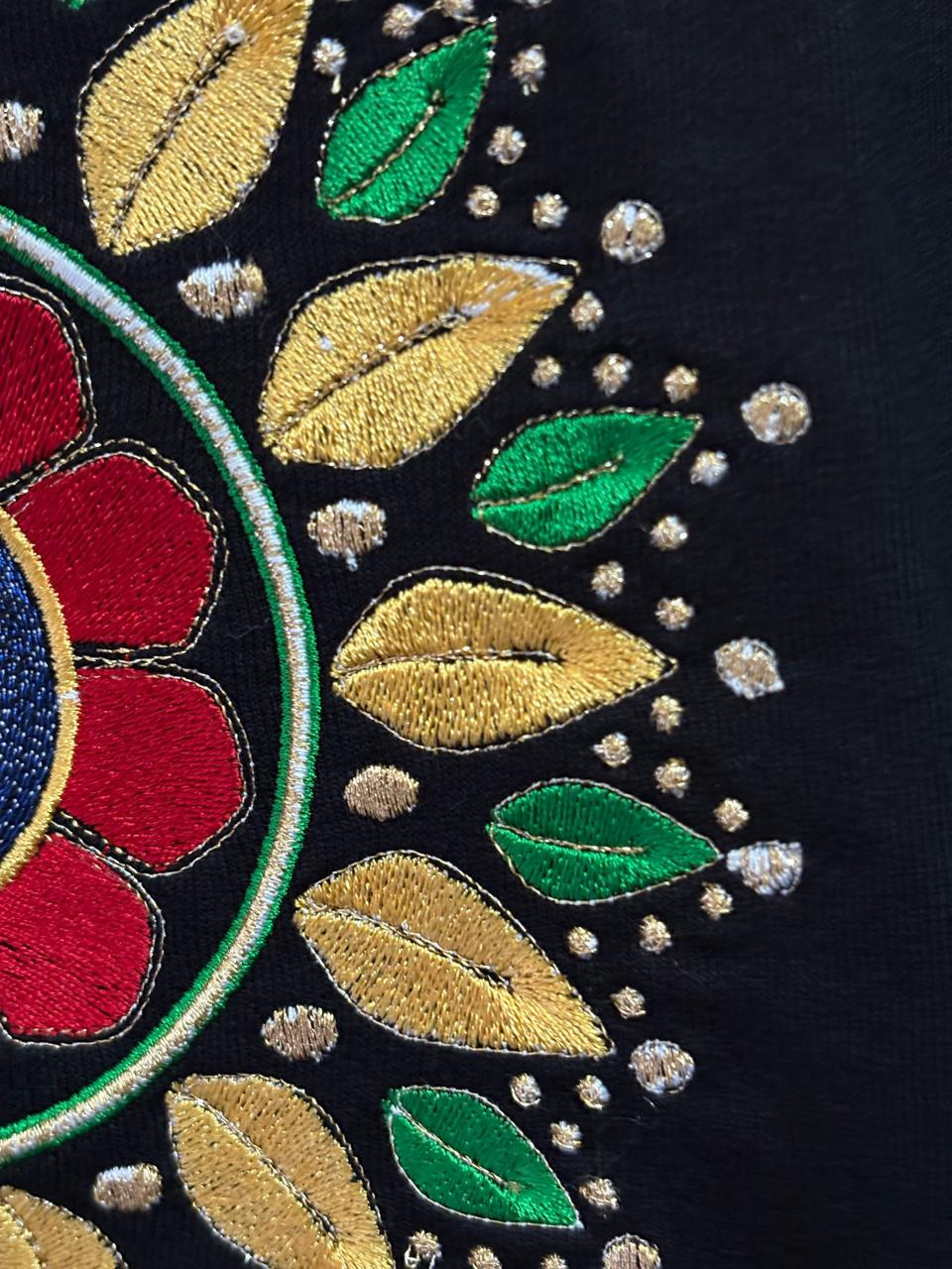 Elevate your everyday look with this striking black t-shirt, featuring a vibrant, intricately detailed mandala design at the center. Crafted from soft, breathable cotton, this tee combines comfort with artistic flair, making it the perfect choice for anyone who values creative expression in their casual wardrobe. Available in a range of sizes to ensure the ideal fit, this unique statement piece is a must-have for those who love to stand out.