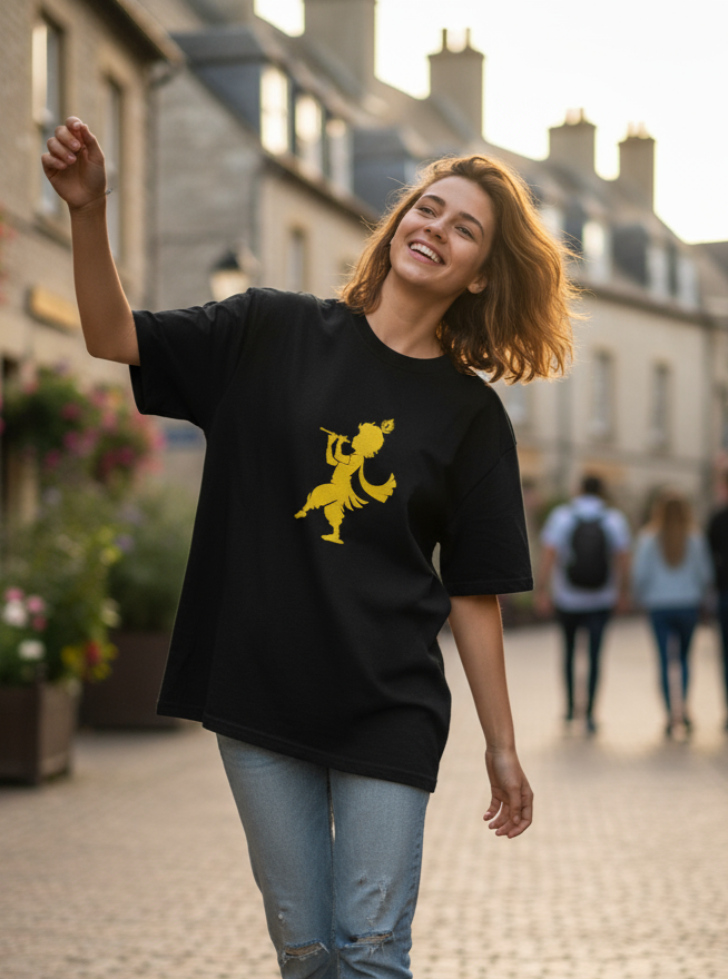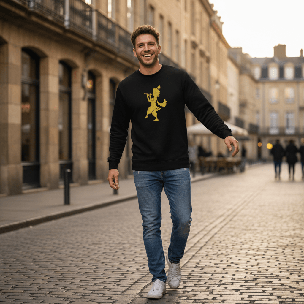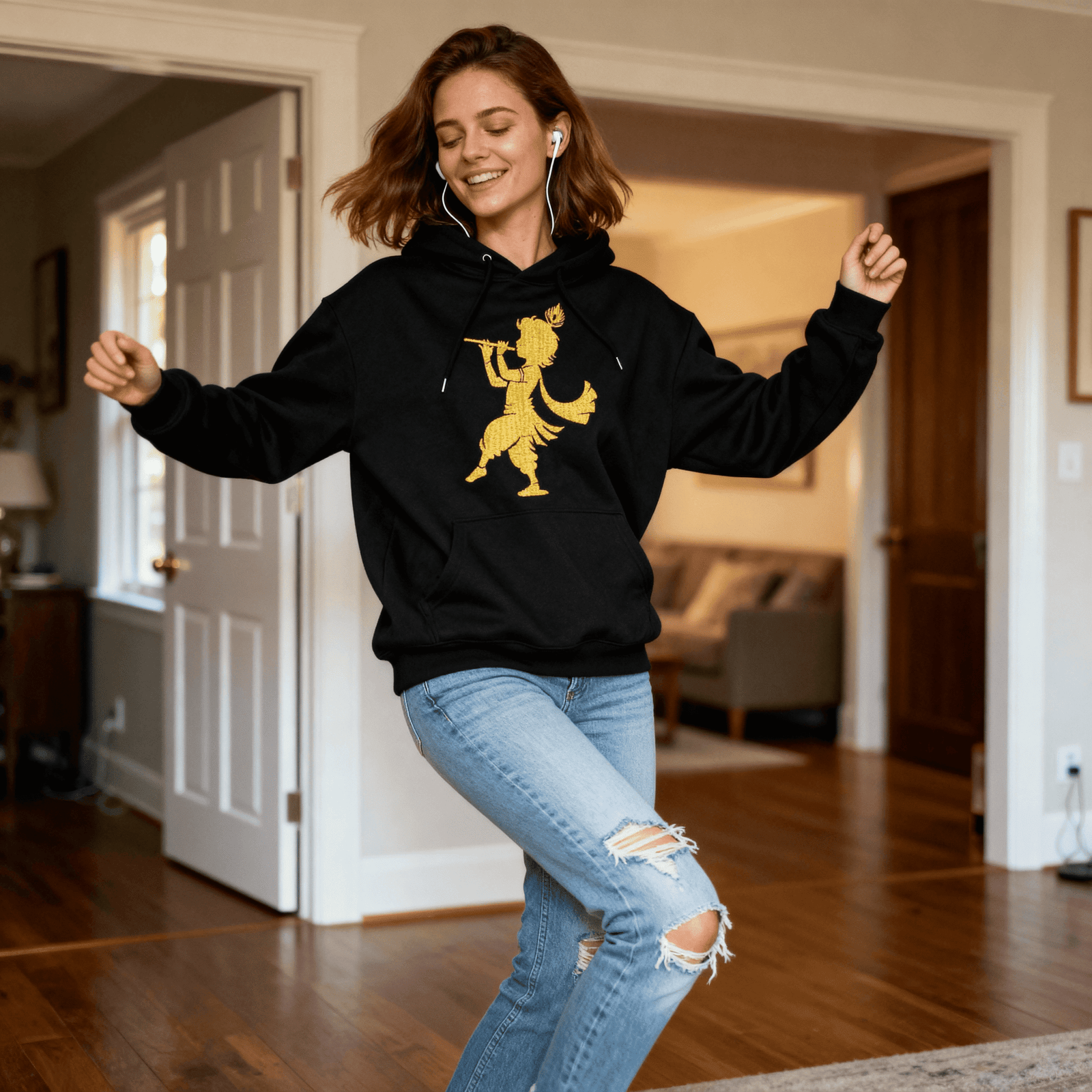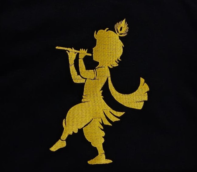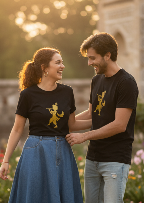 Elevate your everyday wardrobe with this premium black cotton T-shirt, featuring a captivating gold embroidery of Lord Krishna gracefully playing the flute at its center. Adorned with a beautiful golden peacock feather at the back to complete the look. Designed for both comfort and style, this versatile tee seamlessly blends cultural artistry with modern fashion. Ideal for casual outings, spiritual gatherings, or gifting to loved ones, it’s available in multiple sizes to ensure the perfect fit. Pair it with jeans or traditional wear to express your unique style and devotion.