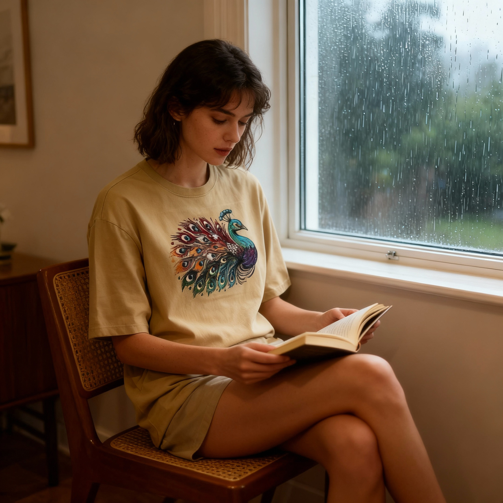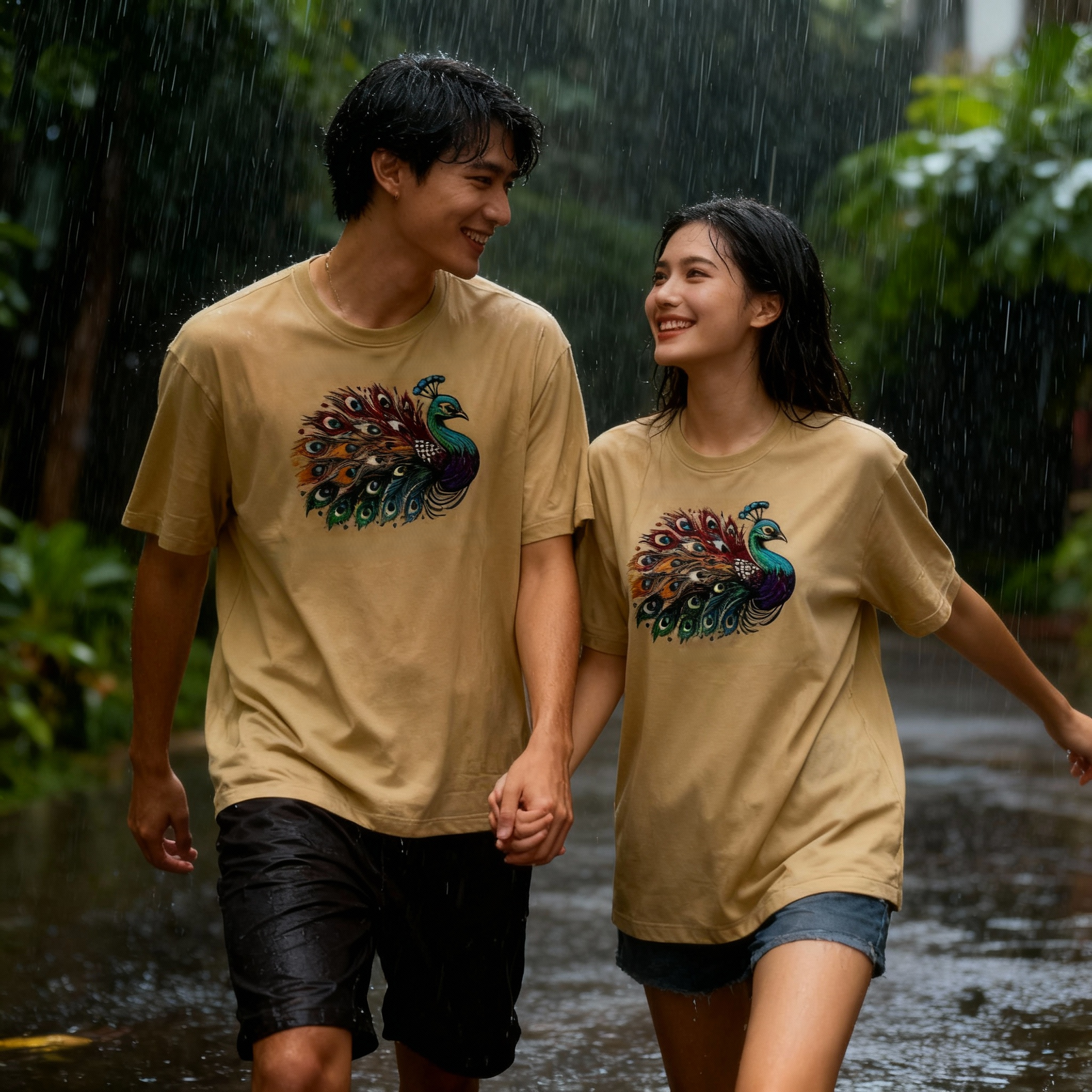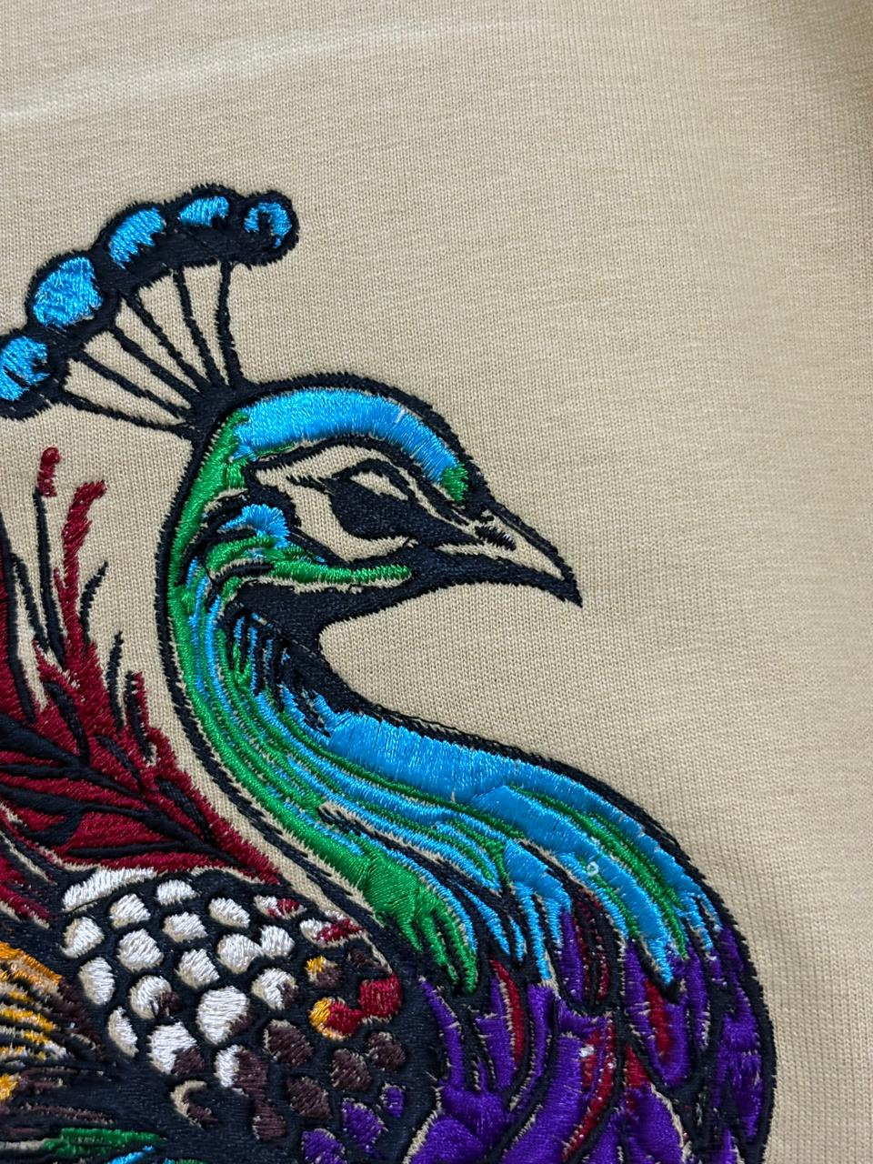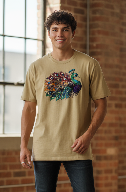 Elevate your everyday look with this stunning tan short-sleeve t-shirt, featuring a vibrant, intricately detailed embroidered peacock graphic that instantly adds artistic flair and personality to any outfit. Crafted from soft, breathable fabric, this tee offers both comfort and style, making it ideal for casual outings, special occasions, or as a thoughtful gift. Available in multiple sizes to ensure your perfect fit.