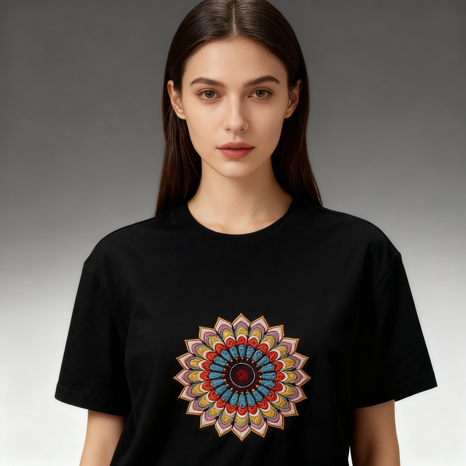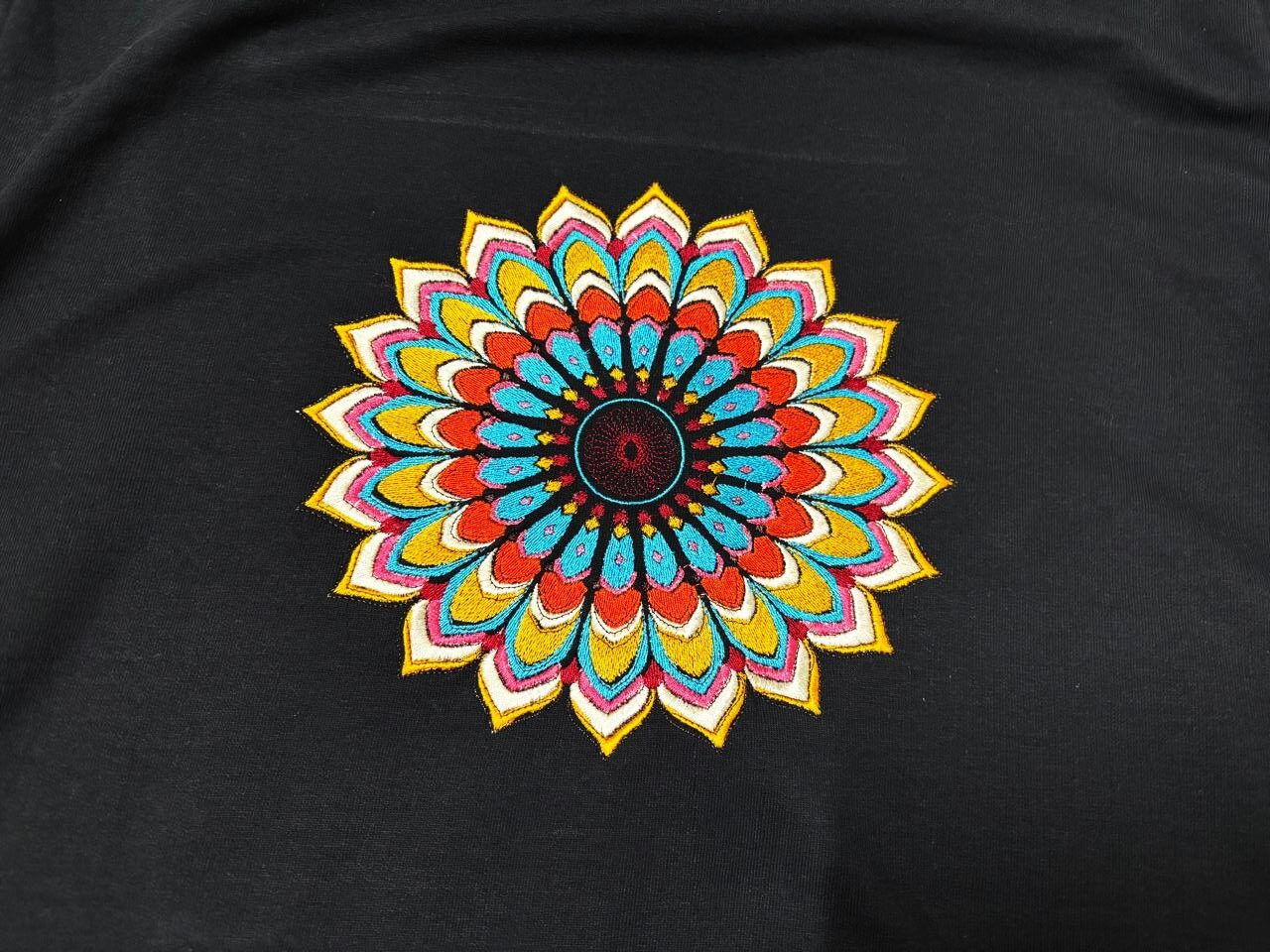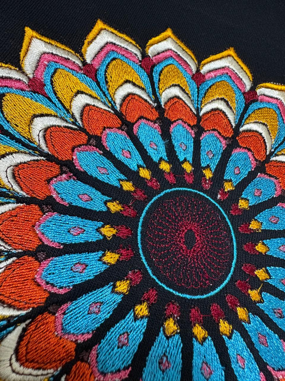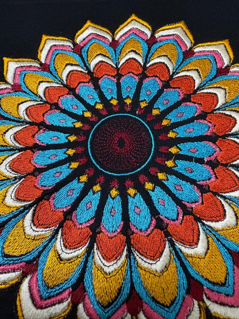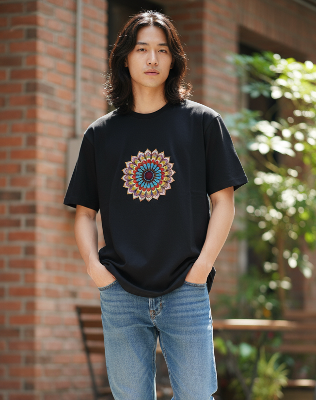 Discover standout style with our premium black t-shirt, featuring a vibrant, hand-embroidered mandala design on the chest. Crafted for comfort and individuality, this soft, breathable tee adds a colorful touch to any wardrobe and offers a unique way to showcase your personality. Available in multiple sizes to ensure the perfect fit, it’s the ideal choice for casual wear, festivals, or making a bold fashion statement. Embrace artistry and comfort in one stylish package.