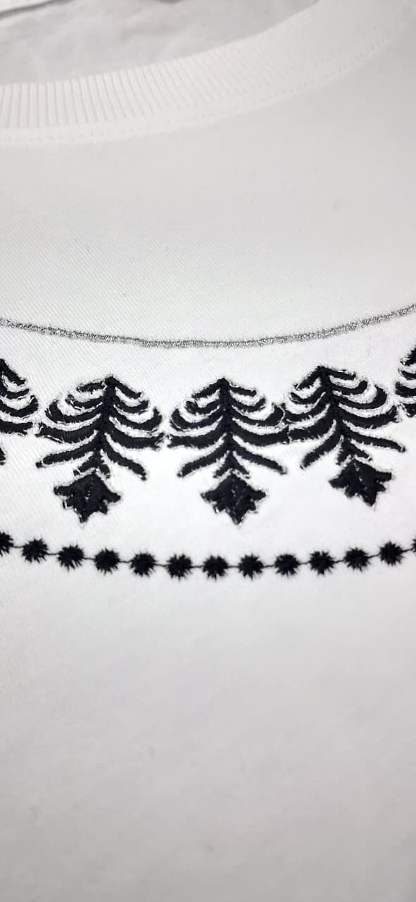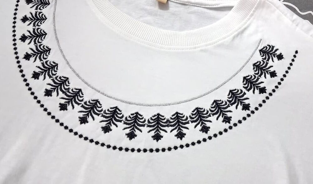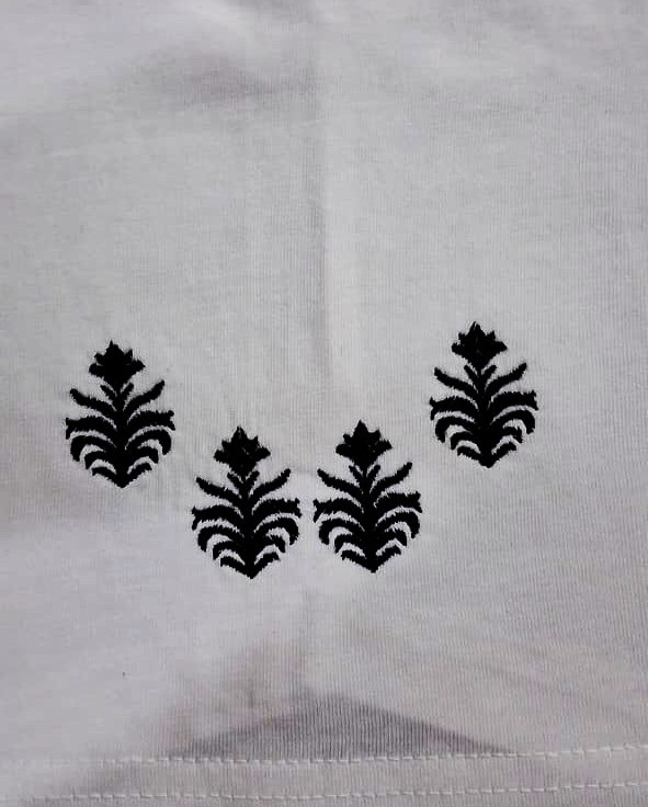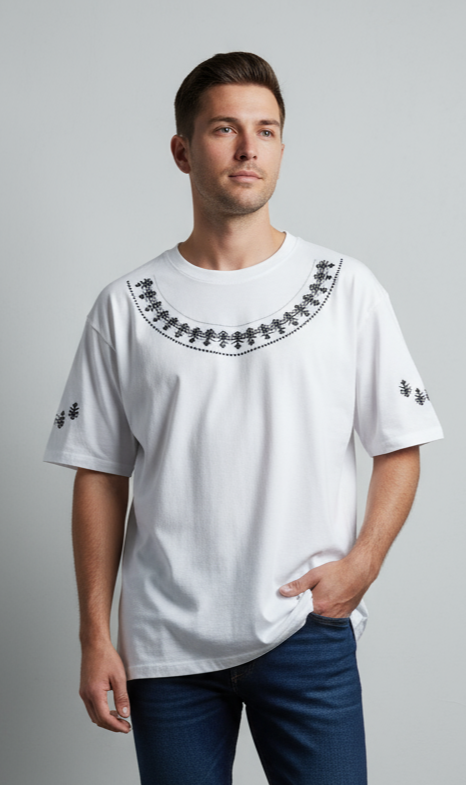 Elevate your everyday style with our embroidered white t-shirt, crafted from soft, breathable fabric for all-day comfort. Featuring exquisite black embroidery on the collar and sleeves, this tee blends classic elegance with a modern twist, making it a standout piece in any wardrobe. Perfect for pairing with jeans or skirts, it’s available in multiple sizes to suit your fit. Make a statement with this unique wardrobe essential.