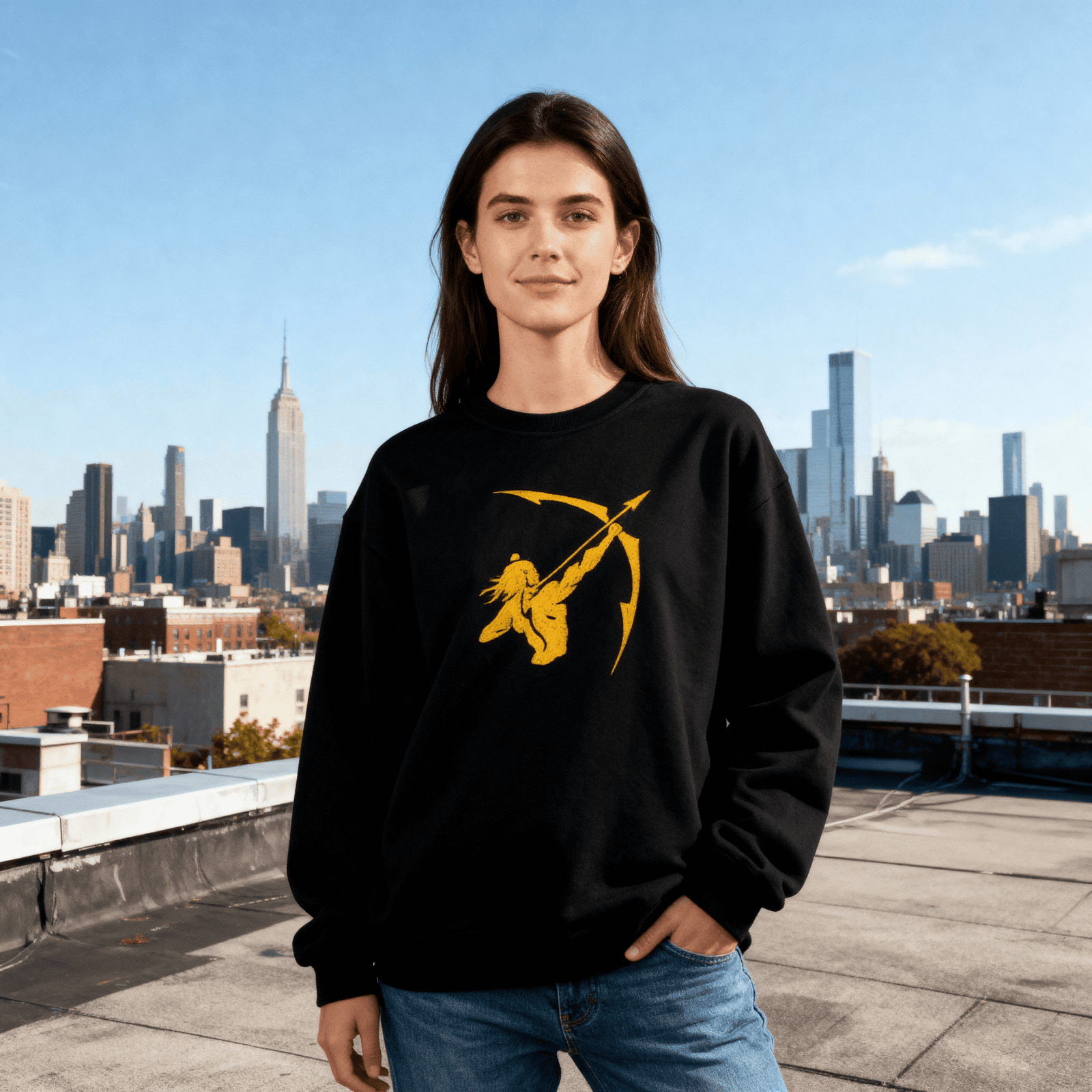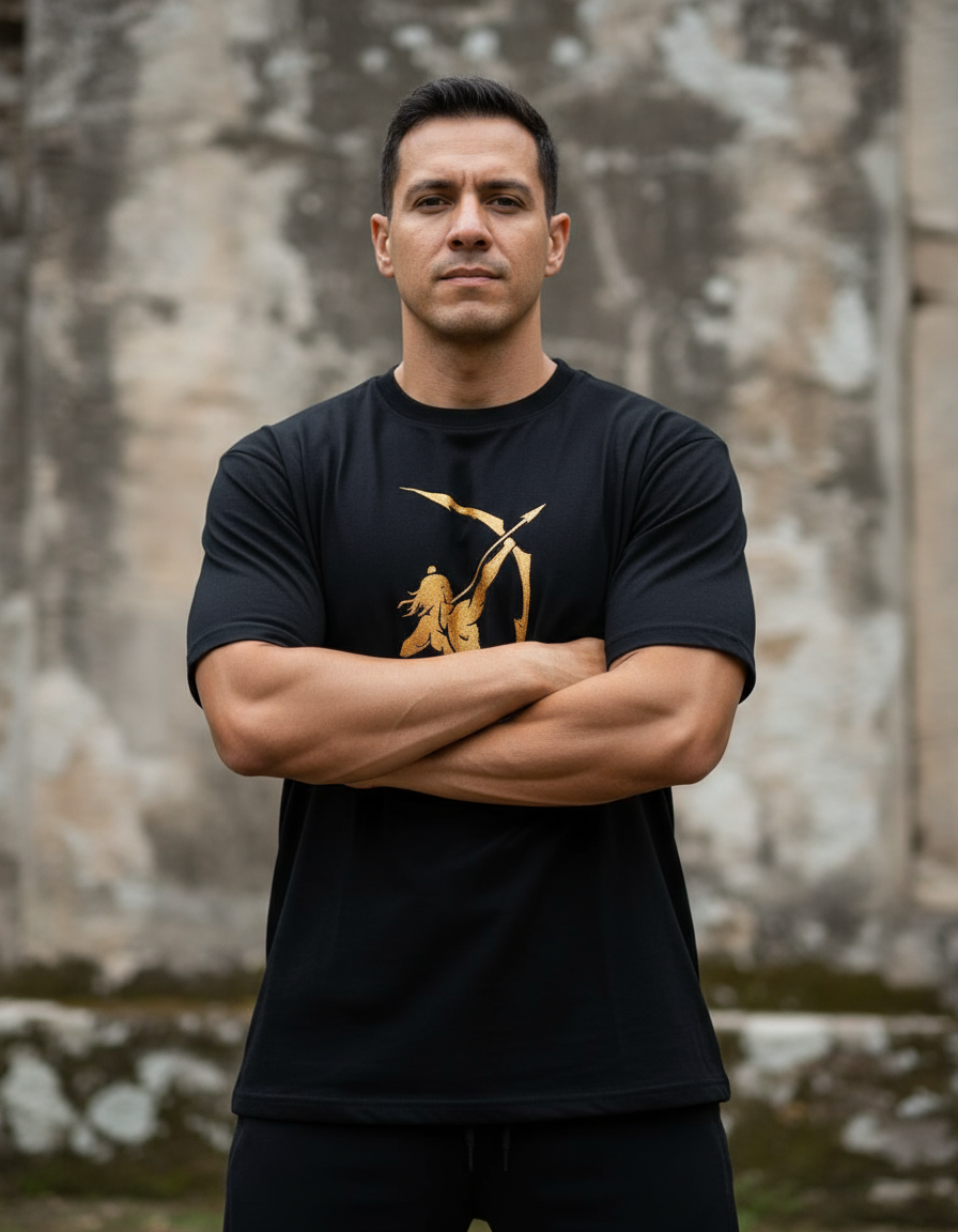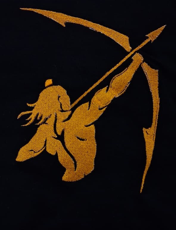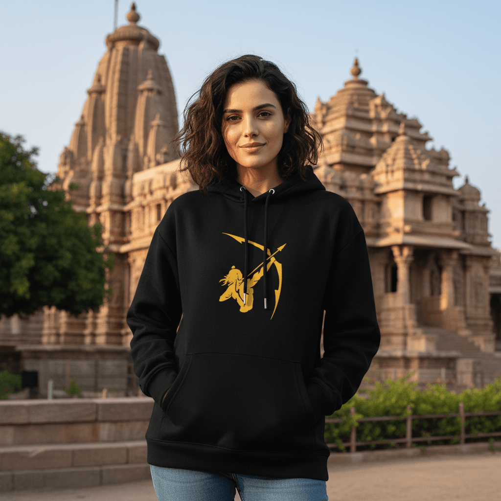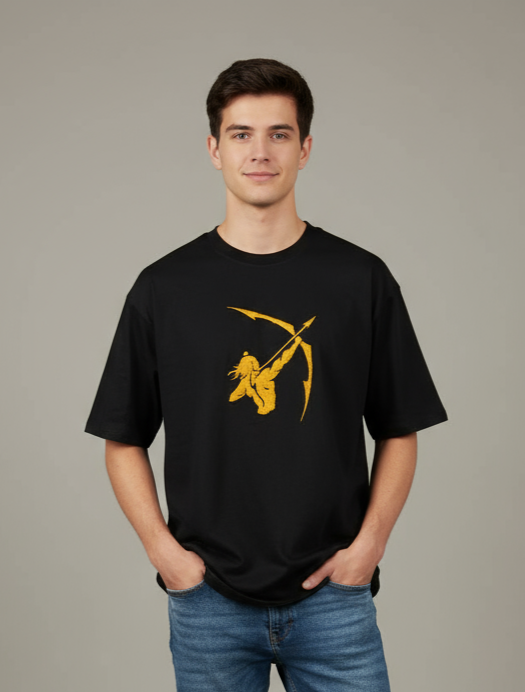 A golden depiction of the legendary archer, symbolizing Lord Ram, stands out with striking clarity on a black T-shirt, embodying courage and warrior strength. The unique design sets you apart, making it an eye-catching addition to any wardrobe. Available in a range of sizes to ensure the perfect fit, this tee combines comfort and individuality in one must-have piece.