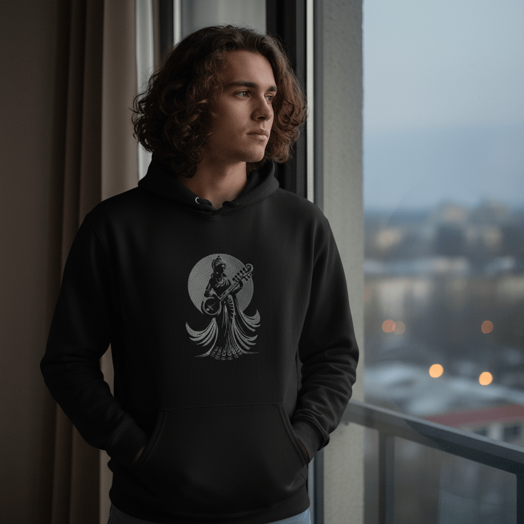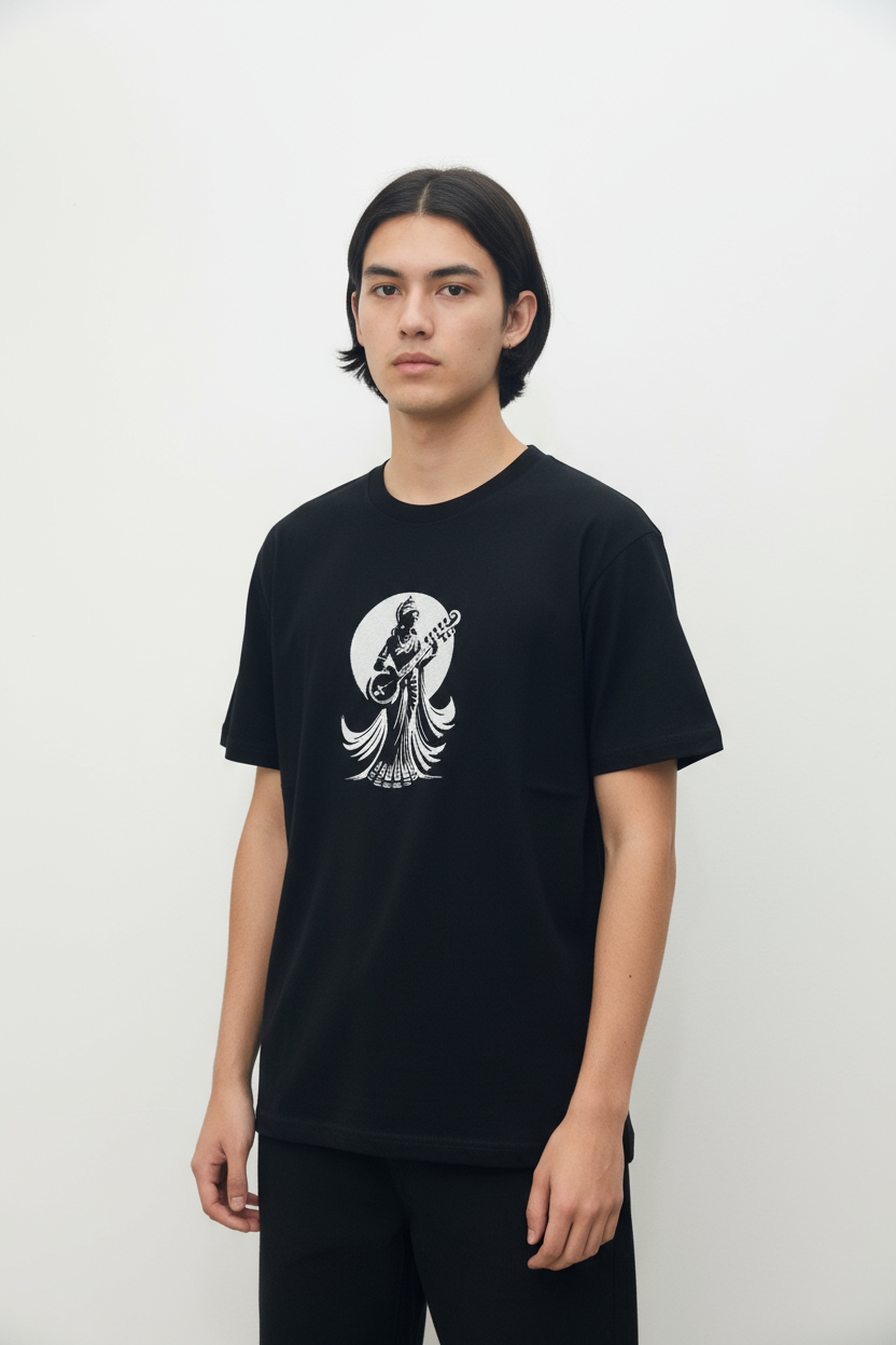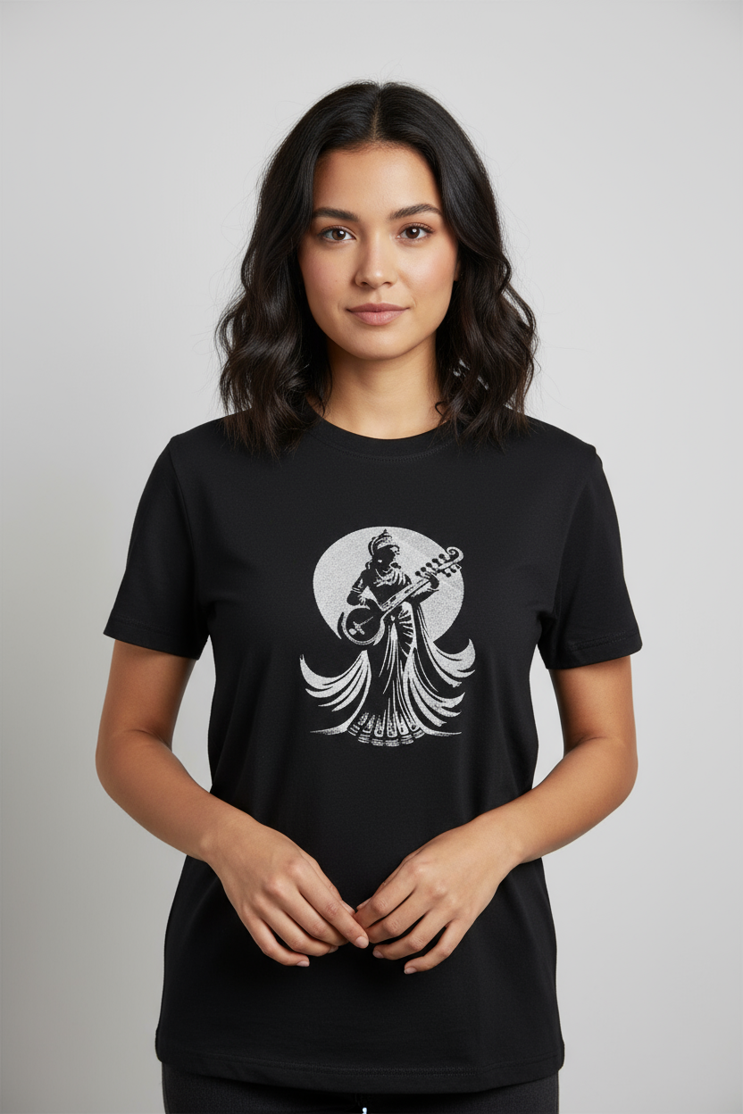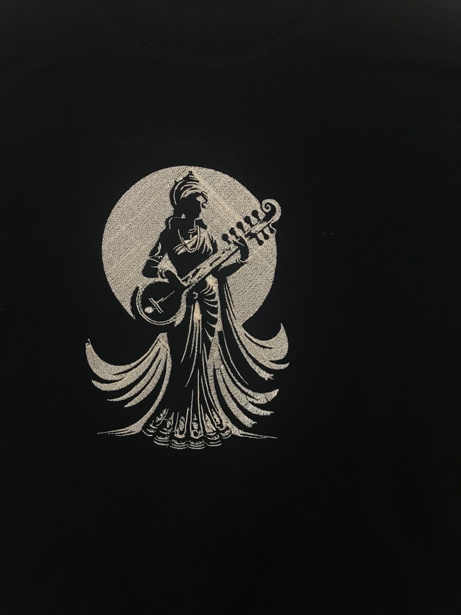 Elevate your wardrobe with our Saraswati Embroidery on Black T-Shirt, featuring an exquisite outline of Goddess Saraswati gracefully playing the veena, set against a striking circular backdrop. Crafted with premium-quality fabric, this t-shirt combines intricate artistry and modern style, making it perfect for everyday wear or special occasions. The elegant black color ensures versatility, while the detailed print adds a touch of cultural sophistication. Available in multiple sizes for a comfortable, tailored fit. Ideal for those who appreciate unique design and spiritual symbolism.