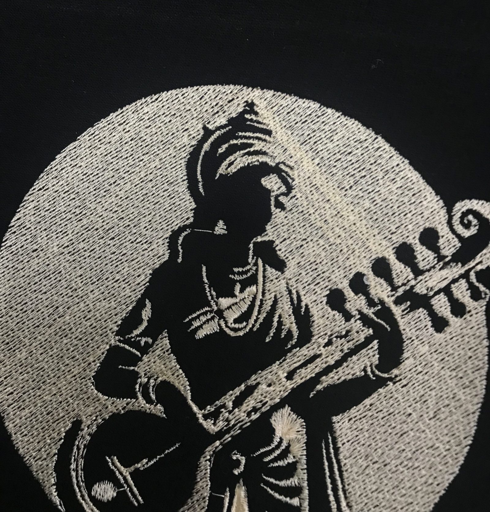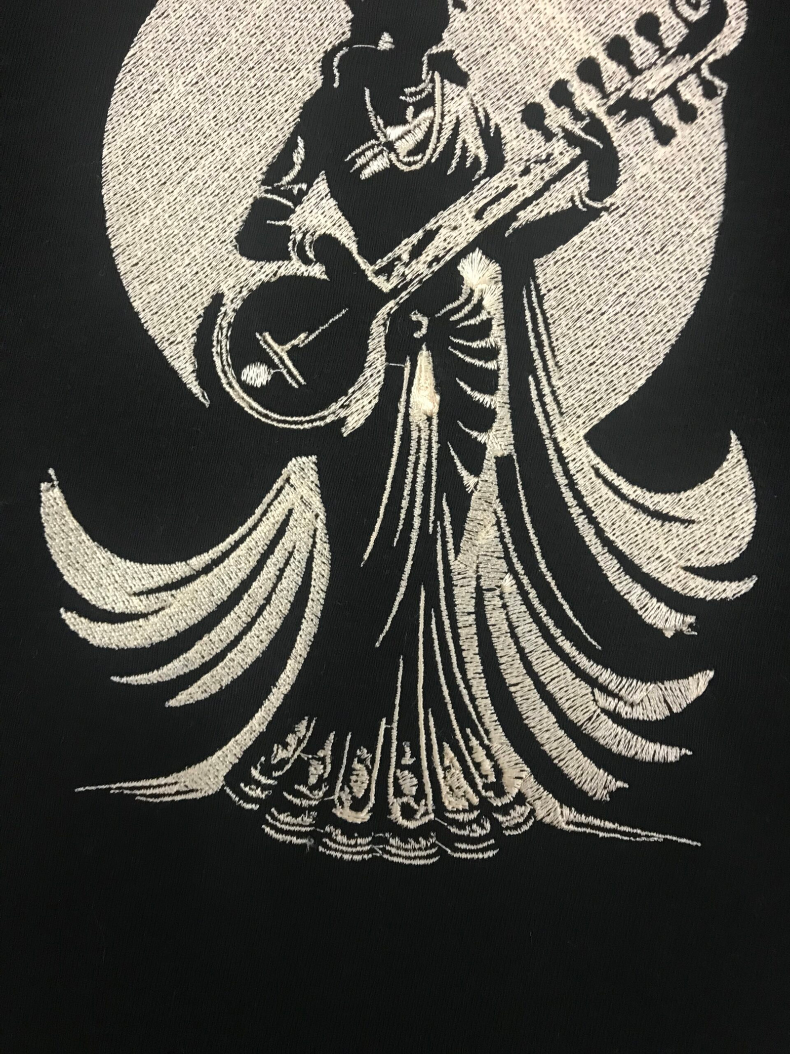 Minimal Saraswati design embroidered with Ivory Gold thread on Black Garment
